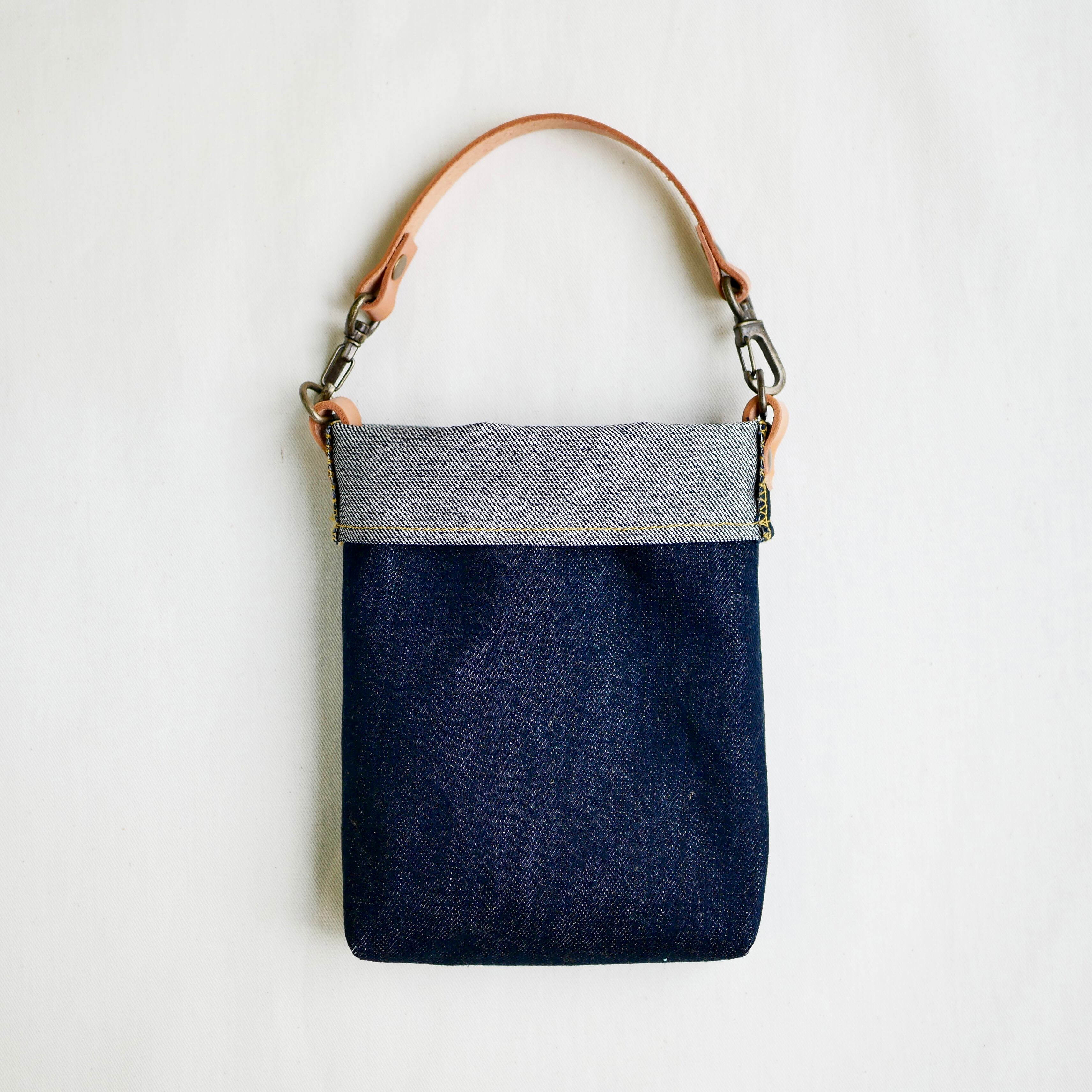 尾州デニムと本革を使った文庫本サイズのポーチです。